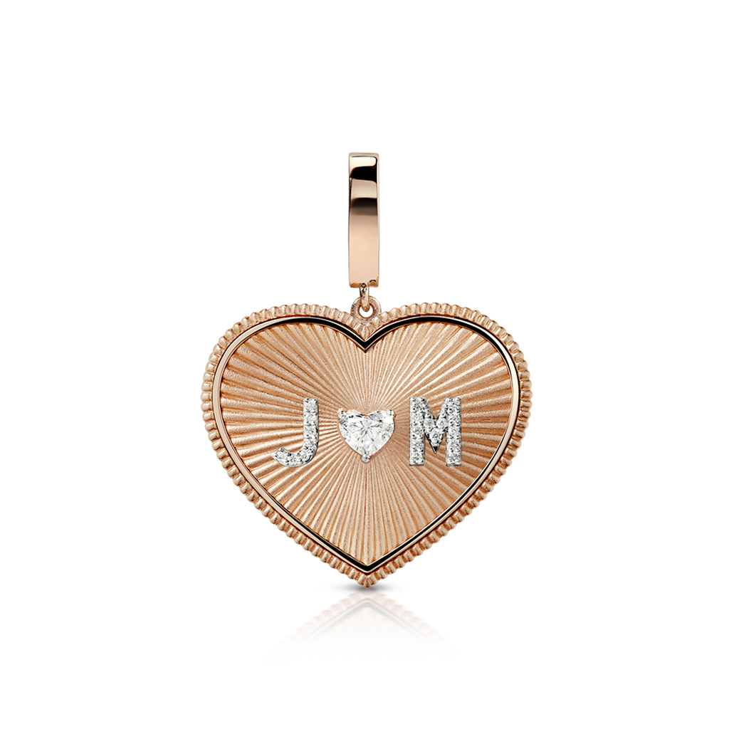 A coin-style medallion with a heart-shaped design and lock detail. Crafted in 18k gold with the option to customize two letters on request. Each initial is set with 0.20ct of diamonds and centered with a 0.20ct heart-shaped solitaire diamond.
