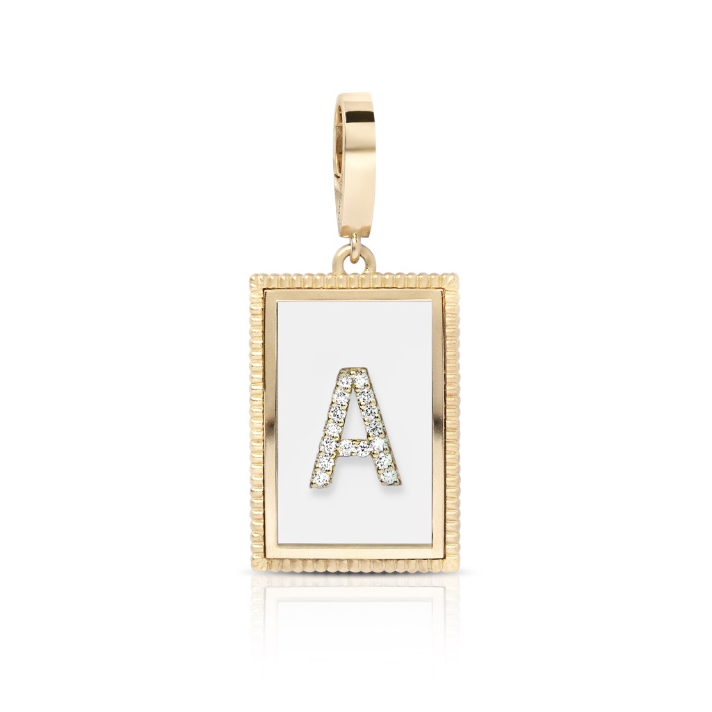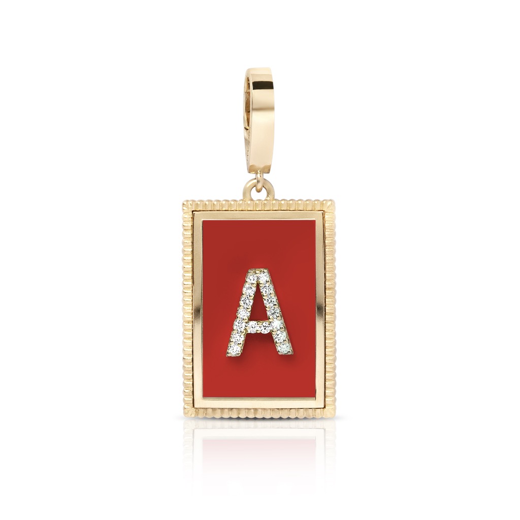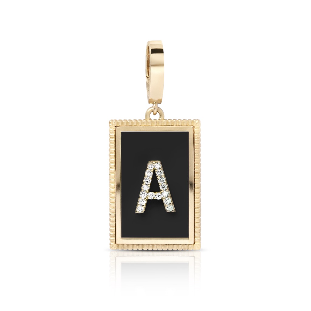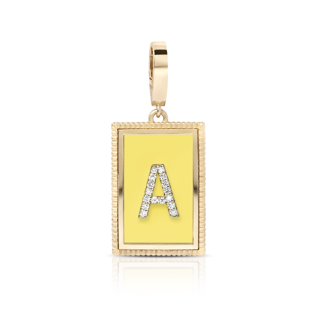 Tag-shaped medallion suspending from a lock-style clasp. The charm features a letter set with diamonds and is embellished with enamel inlay. Customization of enamel color and letters available by order.