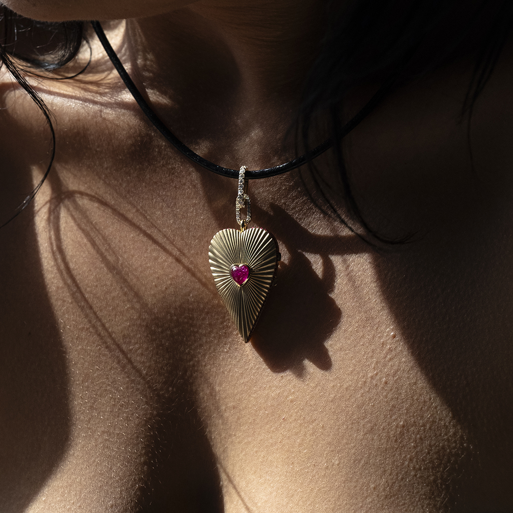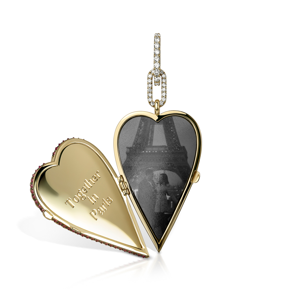 Crafted in solid gold with precision-set gemstones, this fully customizable heart locket is designed to hold your most cherished memory. The front is accented with a central gemstone and delicate rays that catch the light, while the interior opens to reveal space for a photo and a personalized engraved message.