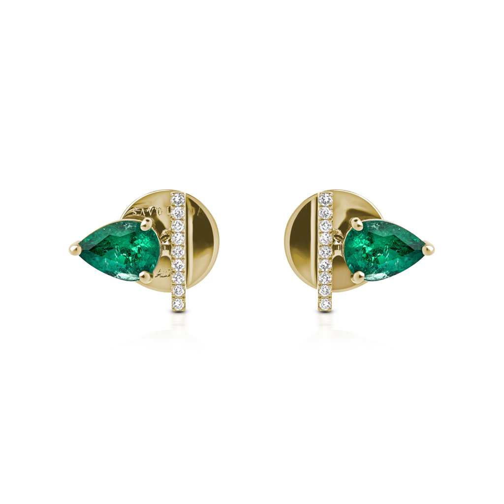 Earrings Studs in 18k Gold set with two Zambian Emeralds sided by a “wall” set in pave diamonds. Complete with post-closure screw.