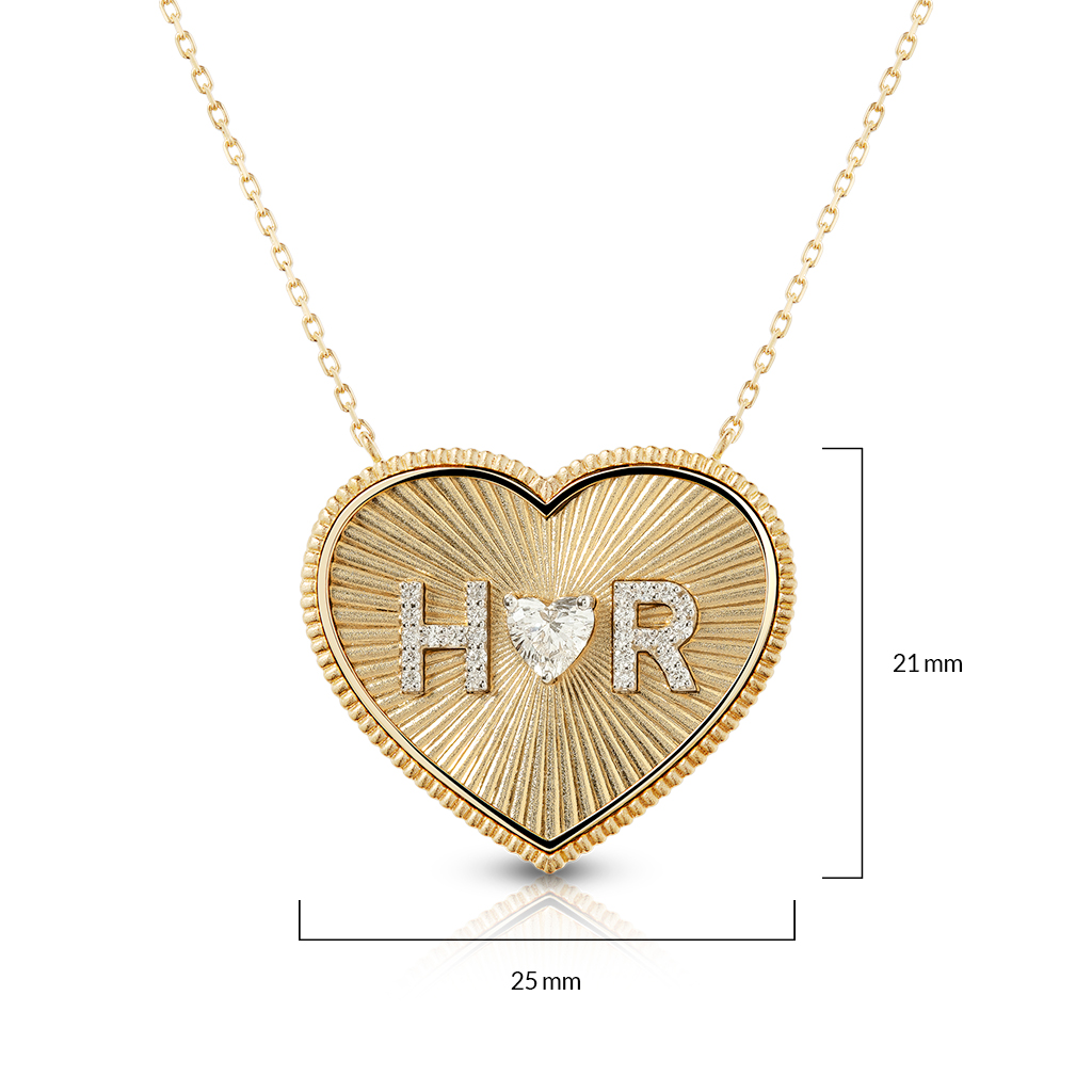 A coin-style medallion in a heart-shaped design suspended from a 46cm chain with an adjustable loop at 44cm and 42cm. The Medallion features two letters set with diamonds and one heart-shaped diamond solitaire.
