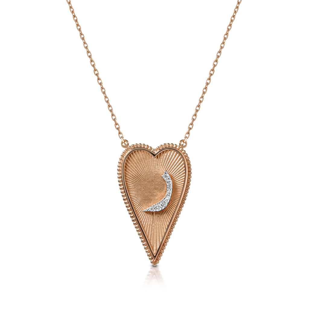 The necklace, crafted in 18k gold, features an elongated heart-shaped design with arabic calligraphy motif set with brilliant-cut diamonds.